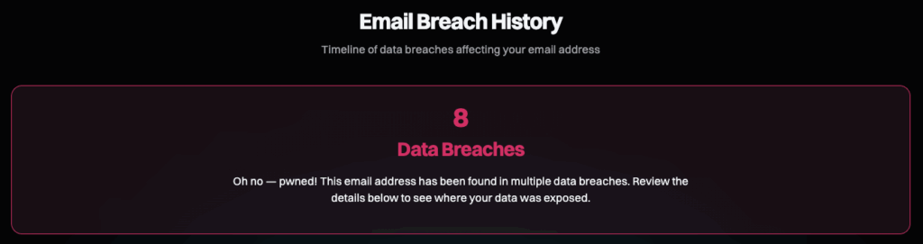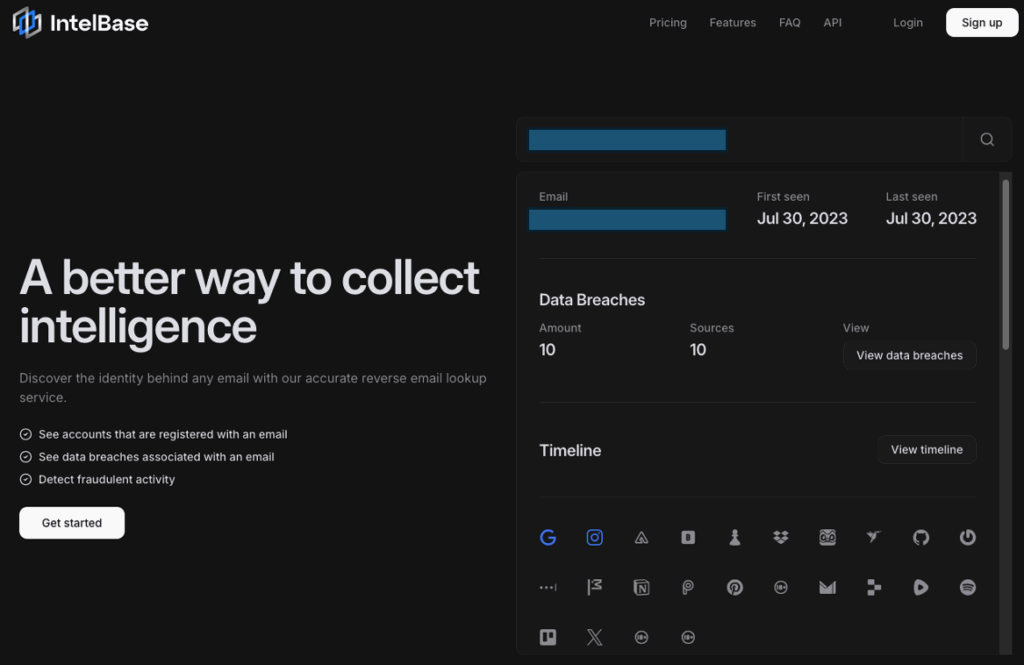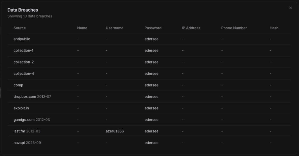 Let’s check for the data of one of data breaches. This can be done by accessing intelbase.is and searching for the affected username; it returns: